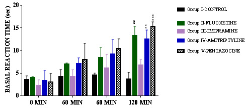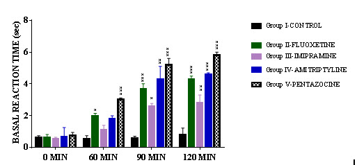 In Tail immersion model of analgesic activity it was shown that Fluoxetine possess significant analgesic activity (*p<0.05 at 60 min interval, ***p <0.001 at 90 and 120 min intervals), Amitriptyline had shown significant analgesic activity (**p<0.01 at 90 min interval and ***p<0.001 at 120 min interval). Imipramine is the mild analgesic agent in this study, showed less significant analgesic activity (*p <0.05 at 90 min interval and **p <0.01 at 120 min interval). The standard drug Pentazocine had shown significant analgesic activity (***p<0.001 at 60, 90 and 120 min interval) [8].