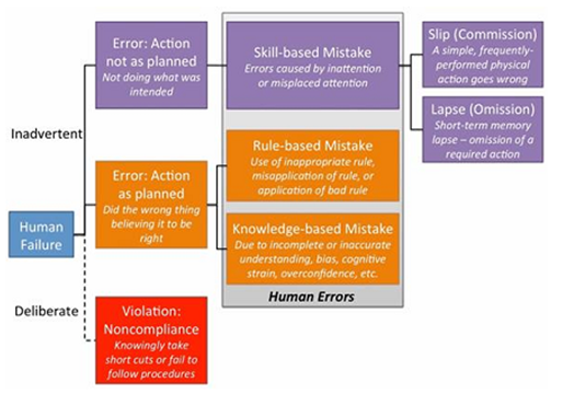 The model identifies that human failures present either as someone intentionally (deliberate) or unintentionally (inadvertent) doing the wrong thing. The inadvertent errors are considered to be human errors, which fall into one of three categories: skill-based, rule- based, or knowledge-based mistakes. Skill-based mistakes can be further broken down into slips or lapses, both of which occur due to a lack of attention to the task at hand.