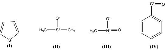 Thus, e.g., thiophen, C4H4S (I) has an index of hydrogen deficiency of (4- 4/2 + 1) = 3. When one compares C6H6 with C6H14, the index is 4 for the former and 0 for the later. In the consideration of the index, polar structures are used, thus the calculated index, 0 for dimethyl sulfoxide (DMSO) is in agreement with the structure II in which the Lewis octet rule is being obeyed. Similarly in nitromethane CH3NO2, the calculated index is 1, and this is in agreement with structure III. Thus any index of hydrogen deficiency greater than 1 may be due to a combination of these structural variations, i.e., an IHD of 2 will indicate 2 double bonds, 2 rings, 1 double bond and one ring or one triple bond. The index of hydrogen deficiency must be a whole no. for an odd electron ion, whereas for an even electron ion the value will be non-integral. Thus the values of index can be applied to the molecular ion as well as to the fragment ions to give useful information. Thus, for example, C7H5O+with an index of 5.5, points to IV as the reasonable assignment.