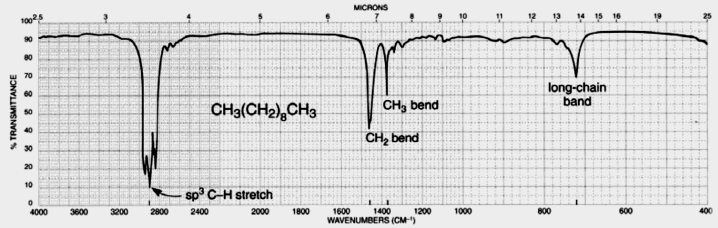 (iii). IR Spectra of alkanes: C-H stretch occurs at 3000 – 2840 cm-1