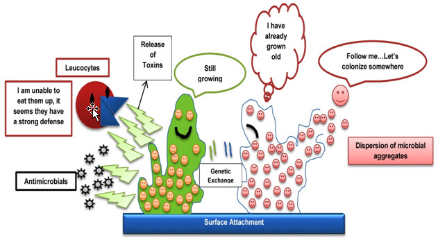 Bacterial biofilms spread their pathogenicity through a number of mechanisms (Figure.2) such as attaching to a solid surface, evading host defenses like phagocytosis, production of high concentration of toxins, resisting anti-microbial agents, exchanging genes resulting in more virulent strains and dispersal of microbial aggregates thus transmitting the microorganisms to other places (Ward et al., 1992; Cochrane, 1988). Biofilms are responsible for a large number of microbial infections in our body such as in formation of dental plaques, child middle ear infections, urinary tract infections (Parsek and Singh, 2003), gingivitis, and contact lenses related infections. They even can be lethal and lead to diseases like endocarditis, infections in cystic fibrosis patients and can also infect permanent indwelling devices such as heart valves and joint prostheses (Hall-Stoodley et al., 2006).