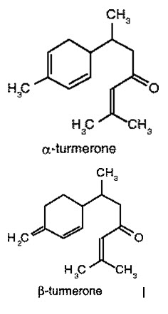 Pale yellow to orange-yellow volatile oil (6%) composed of a number of monoterpenes and sesquiterpenes, including zingiberene, curcumene, α- and β- turmerone among others. The colouring principles (5%) are curcuminoids, 50–60% of which are a mixture of curcumin, monodesmethoxycurcumin and bisdesmethoxycurcumin (1, 6, 25). Representative structures of curcuminoids are presented below.