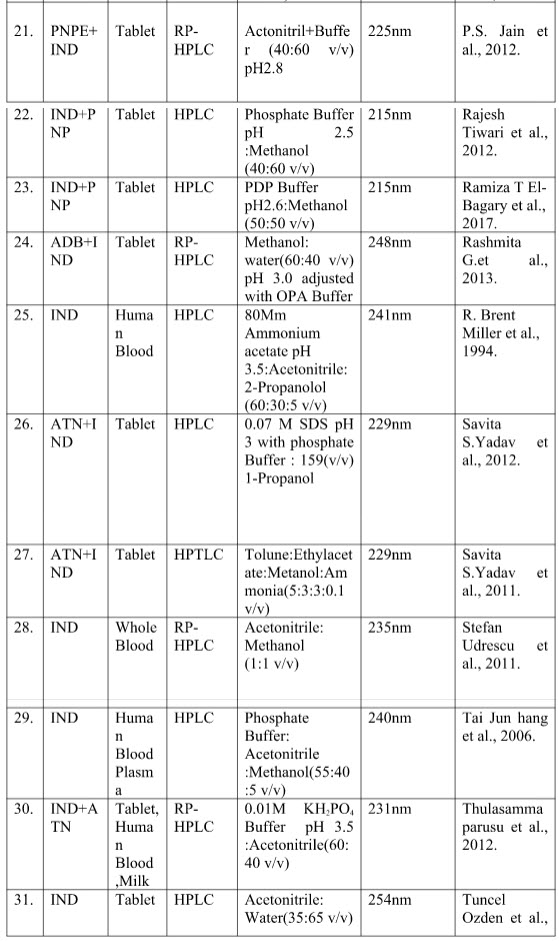 [IND-Indapamide; RP-HPLC- Reverse phase high performance liquid chromatography; HPLC- High performance liquid chromatography; HPTLC-High performance liquid chromatography; ADB-Amlodipine Besylate; AML-Amlodipine ;ATN-Atenolol; DCM-Dichloromethane ;GAA-Glacial acetic acid ;IPLC-Ion pair liquid chromatography ;KH2PO4-Potassium dihydrogen orthophosphate ;LSP-Lisinopril; NBL-Nebivolol OLM-Olmisarthan; OPA-Orthophosphoric acid; PDP-Potassium dihydrogen phosphate ;PNP-Perindopril ;PNPE-Perindopril Ebrumine ;RP-UPLC-Reverse phase –Ultra performance liquid chromatography ;SDS-Sodium dodecyl sulphate ;TEL-Telmisarthan ; UPLC-Ultra performance]