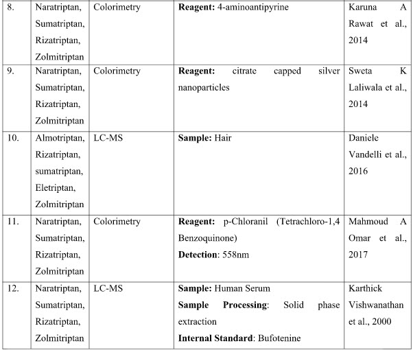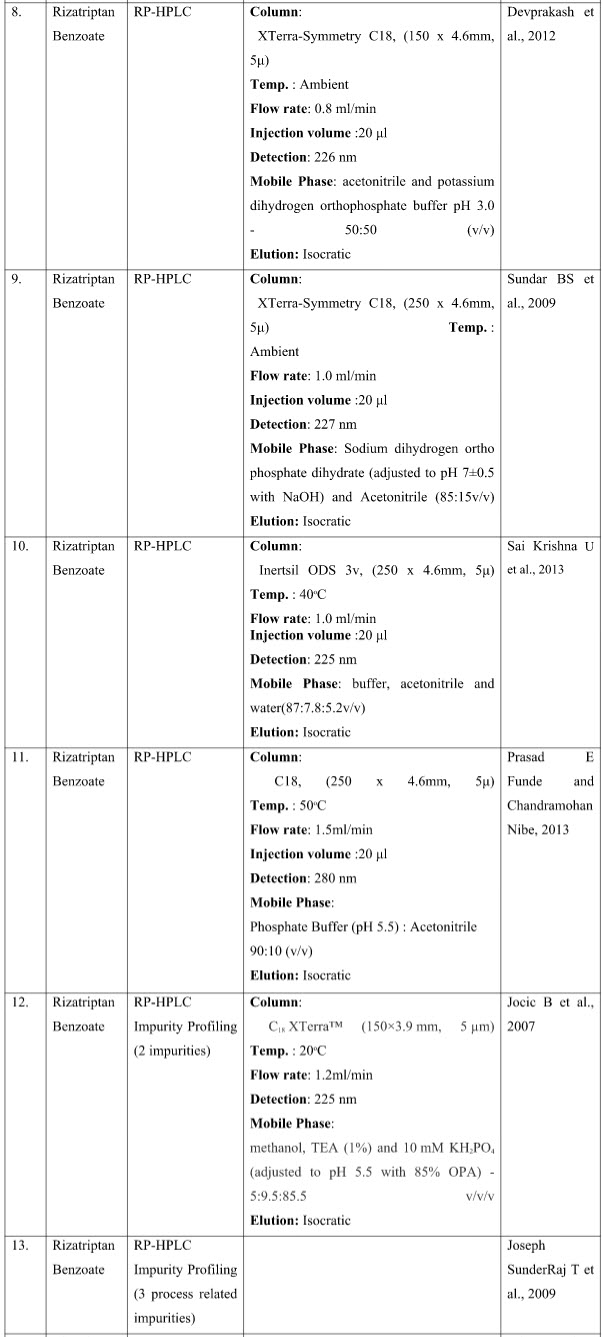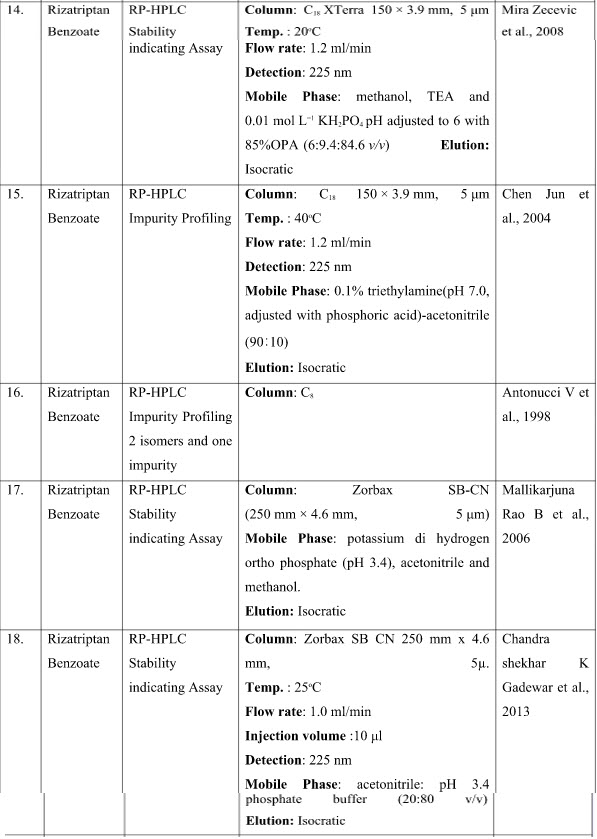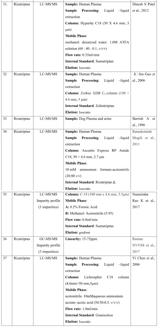 Various analytical methods have been developed for the estimation of Rizatriptan in single and in combination which includes Spectrophotometric, HPLC, HPTLC, LC-MS methods.