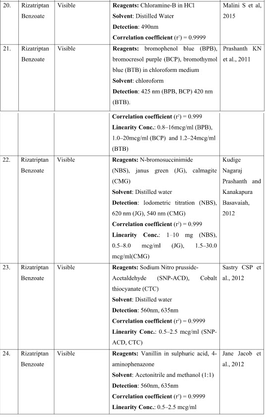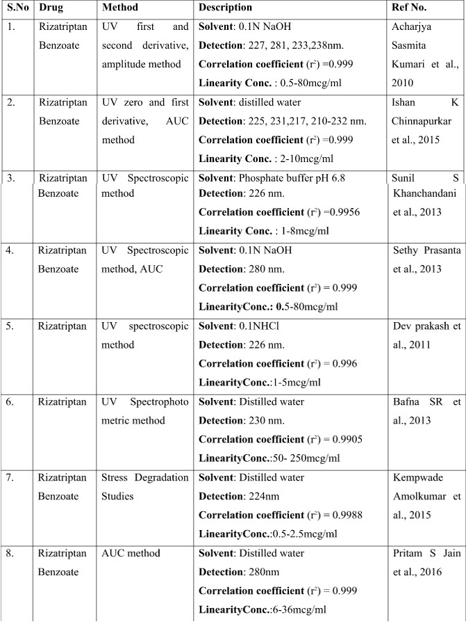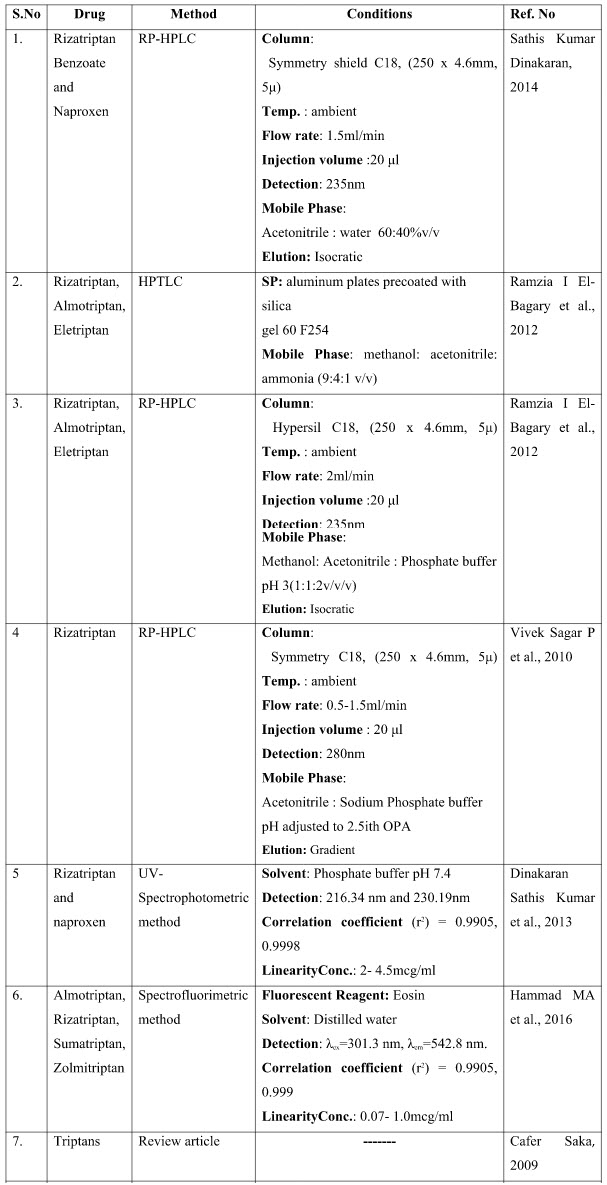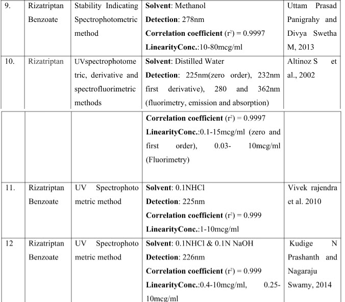 The presented exhaustive review covers the analytical methods for the determination of Rizatriptan and its combination in pharmaceutical and biological samples like serum and plasma. Various spectrophotometric and chromatographic conditions are presented in table.