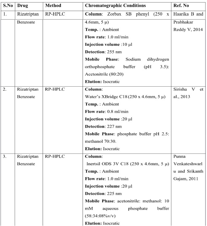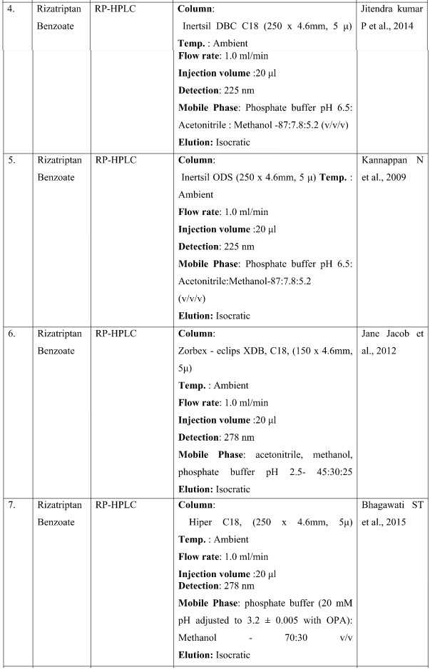 32. Kannappan N, Madhukar A, Ganesh A, Naveen Kumar CH, Mannavalan R. International Journal of Pharm Tech Research. Analytical method development and validation of Rizatriptan benzoate tablets by RP-LC. 2009; 1(4): 1704-1708.