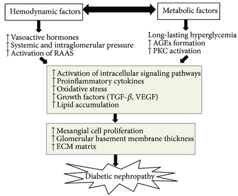 Multigenetic predisposition contributes in the development of diabetic nephropathy, thus supporting that many factors are involved in the pathogenesis of the disease. Hyperglycemia induces renal damage directly or through hemodynamic modifications. It induces activation of protein kinase , increased production of advanced glycosylation end products, and diacylglycerol synthesis. In addition, it is responsible for hemodynamic alterations such as glomerular hyperfiltration, shear stress, and microalbuminuria. These alterations contribute to an abnormal stimulation of resident renal cells.
