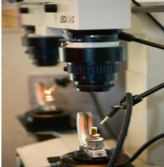 The comparison microscope is actually two microscopes connected to one eyepiece. The image on the right is of the specimen under the microscope on the right and can be compared side-by- side to the image on the left.The comparison microscope is particularly useful when comparing bullet striations, fibers, and hair samples.