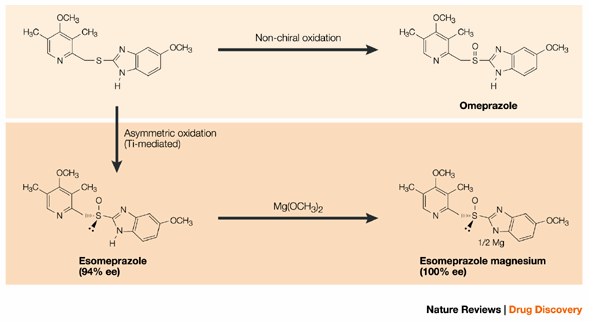 Figure 9: | Synthesis of omeprazole and esomeprazole. The large-scale production of esomeprazole is achieved by asymmetric oxidation of the same sulphide intermediate as is used in the production of omeprazole, which gives a 94% enantiomeric excess (ee). This is increased to 100% by preparing a magnesium salt of of esomeprazole and then performing a crystallization.[6]