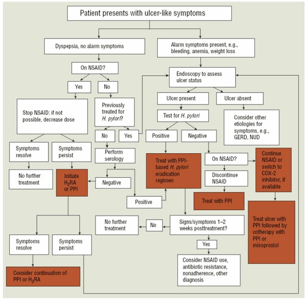 Figure 10: Algorithm guidelines for the evaluation and management of a patient with dyspeptic or ulcer-like symptoms. (COX-2, Cyclooxygenase-2; GERD, gastroesophageal reflux disease; H.Pylori, Helicobacter pylori; H2RA, H2-Receptor Antagonist; PPI, Proton Pump Inhibitor; NSAID, non-steroidal anti-inflammatory drug; NUD, non-ulcer dyspepsia.[11]