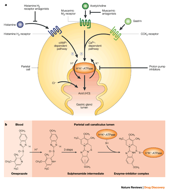 Figure 8:| Proton-pump inhibition. a | Gastric acid is secreted by parietal cells of the stomach in response to stimuli such as the presence of food in the stomach or intestine and the taste, smell, sight or thought of food. Such stimuli result in the activation of histamine, acetylcholine or gastrin receptors (the H2, M3 and CCK2 receptors, respectively) located in the basolateral membrane of the parietal cell, which initiates signal transduction pathways that converge on the activation of the H+K+-ATPase — the final step of acid secretion. Inhibition of this proton pump has the advantage that it will reduce acid secretion independently of how secretion is stimulated, in contrast to other pharmacological approaches to the regulation of acid secretion; for example, the inhibition of acid secretion by H2 receptor antagonists can be overcome by food-induced stimulation of acid secretion via gastrin or acetylcholine receptors.