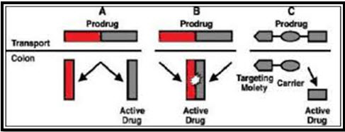 Pro-drug are pharmacologically inactive chemical derivatives that could be used to alter the physiochemical properties of drug in a temporary manner or to increase their usefulness  and to decrease associated toxicity. A pro-drug is a compound formed by chemical modification of biologically active compound that will liberate the active compound in vivo by enzymatic or chemical processes (Vimal and Vikram, 2012). Pro-drug is the main approach of microbial triggered drug delivery system is system in which the drug release from the formulation is triggered by the micro flora present in the gut. (M. Prathap et al., 2014). Biotransformation is carried out by a variety of enzymes, mainly of bacterial origin, present in the colon. The enzymes that are mainly targeted for colon drug delivery include azoreductase-galactosidase, B-xylsidase, nitroreductases. Generally, a pro-drug is successful as a colon drug carrier of it is hydrophilic and bulky, to minimize absorption from the upper GI tract and once in the colon, it is converted into a more lipophilic drug molecule that is then available for absorption (Threveen et al., 2011). A clinical study ha shown clear evidence that B-cyclodextrins are poorly digested in the small intestine but are almost completely degraded by the colonic microflora (C. Tuleu et al., 2001).