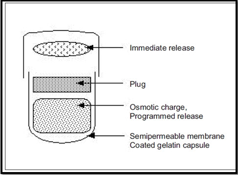 The port system was developed therapeutic system research laboratory Ann Arbor, Michigan, USA, and consist of a capsule coated with a semi-permeable membrane, inside the capsule was an insoluble plug consisting of osmotically active agent and the drug formulation (Vipul and Moinuddin, 2012). When this capsule came in contact with the dissolution fluid, the semi-permeable membrane allowed the entry of water, which caused the pressure to develop and the insoluble plug expelled after a lag time. This system avoids second time dosing, which was beneficial for school children during daytime (J. Ali et al., 2006). The lag time is controlled by coating thickness. The system showed good correction in lag time of in-vitro and in-vivo experiments in humans (V.N.L. Sirisha et al., 2012).