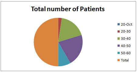 In this study total of 70 patients were enrolled in the study. The Females population is 28.The age wise Female patients population ranges from the 0 Patients were in the age group of 10-20 and 20-30 years, 7 Patients were in the age group of 30-40 years ( 25 %),13patients were in the age group of 40-50 years ( 46.42 %), 3patients were in the age group of 50-60 years( 10.71 %),4 patients were in the age group of 60-70 years ( 14.28 %),1 patients were in the age group of 70-80 years ( 3.57142 %).