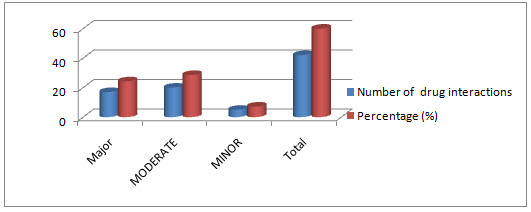 Total 64 drug interactions were screened during the study period.In which 17 (24.28571%) prescriptions having major drug interaction, 5 (7.1428571%) Prescriptions having minor drug interaction, 20 (28.57142851%) prescriptions having moderate drug interactions.