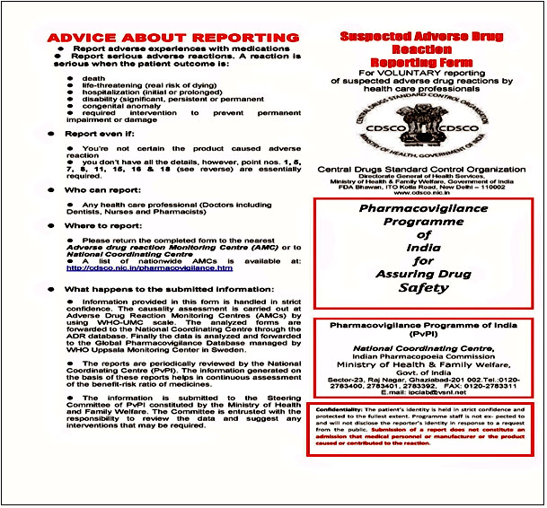 As per the pharmacovigilance program all Health professionals working in the field of delivering the health care (both conventional and unconventional) like physicians, dentists, nurses, pharmacists, can report suspected adverse drug reactions by letter, phone, fax, e-mail, or by personal contact to any of the five adverse drug reaction monitoring centers located across the country.