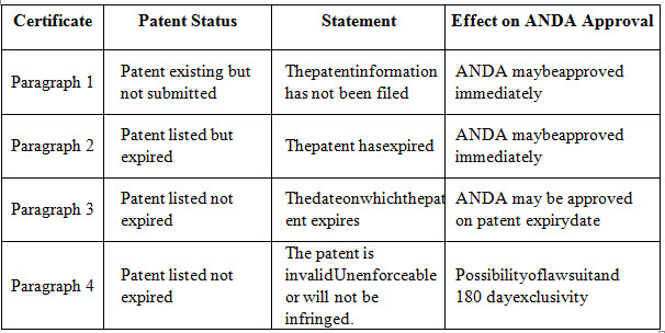 Hatch-Waxman provides that an applicant for an ANDA or a 505(b)(2) applicant must make an appropriate certification respecting marketing of the generic drug. In an effort to encourage generic drug entry into the pharmaceutical market, the Hatch-Waxman Act provides a commercial incentive to those generic companies who are the first to file ANDAs incorporating Paragraph IV Certifications challenging infringement or validity of Orange Book–listed brand-name pharmaceutical patents. Thus, in the event the listed brand-name patent(s) are adjudged to be invalid or not infringed prior to their normal expiration date(s), the first generic filer entitled to approval of its ANDA receives a 180-day exclusivity period, during which no other ANDA can be approved for the same product. In such circumstances, the first entity to file an ANDA can be the only generic marketer for 180 days.