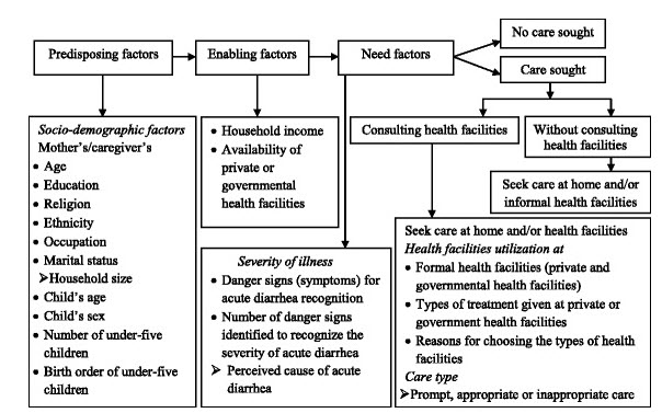 Figure 1. Conceptual framework for health-seeking behavior modified from Andersen’s behavioral model (Adane et.al, 2017), which is widely accepted and used to study the predictors of health-seeking behavior and health facility utilization for various diseases, including childhood diarrhea in slums of Addis Ababa, Ethiopia.