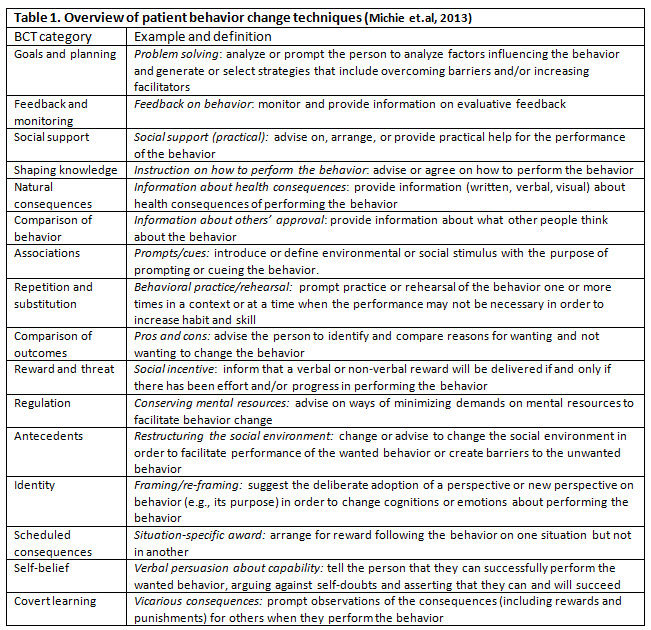 61. Michie S, Richardson M, Johnston M, Abraham C, Francis J, Hardeman W, Eccles MP, Cane J, Wood CE. (2013); The behavior change technique taxonomy (v1) of 93 hierarchically clustered techniques: building an international consensus for the reporting of behavior change interventions; Ann Behav Med; ;46(1):81-95