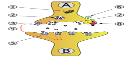 Activity at an axon terminal: Neuron A is transmitting a signal at the axon terminal to neuron B (receiving). Features: 1. Mitochondrion. 2. synaptic vesiclewith neurotransmitters. 3. Autoreceptor. 4. Synapsewith neurotransmitter released (serotonin). 5. Postsynaptic receptors activated by neurotransmitter (induction of a postsynaptic potential). 6. Calcium channel. 7. Exocytosis of a vesicle. 8. Recaptured neurotransmitter