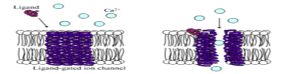 LIGAND-GATED ION CHANNELS(LGICS)- Ligand-gated ion channels (LGICs) are a group of transmembrane ion channel proteins which open to allow ions such as Na+, K+, Ca2+, or Cl- to pass through the membrane in response to the binding of a chemical messenger (i.e. a ligand),24 such as a neurotransmitter.25 These proteins are typically composed of at least two different domains: a transmembrane domain which includes the ion pore, and an extracellular domain which includes the ligand binding location (an allosteric binding site). This modularity has enabled a 'divide and conquer' approach to finding the structure of the proteins (crystallising each domain separately). The function of such receptors located at synapses is to convert the chemical signal of presynaptically released neurotransmitter directly and very quickly into a postsynaptic electrical signal. Many LGICs are additionally modulated by allosteric ligands, by channel blockers, ions, or the membrane potential. LGICs are classified into three superfamilies which lack evolutionary relationship: Cys-loop receptors, Ionotropic glutamate receptors and ATP-gated channels. LGICs can be contrasted with metabotropic receptors (which use second messengers), voltage-gated ion channels (which open and close depending on membrane potential), and stretch-activated ion channels (which open and close depending on mechanical deformation of the cell membrane).26,27