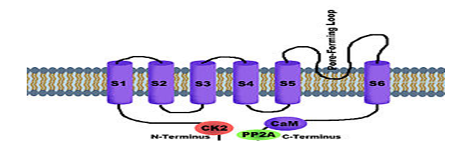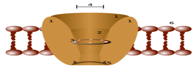 Schematic diagram of an ion channel. 1 - channel domains (typically four per channel), 2 - outer vestibule, 3 - selectivity filter, 4 - diameter of selectivity filter, 5 - phosphorylation site, 6 - cell membrane.