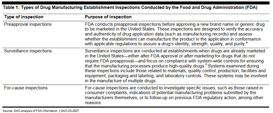 Drugs manufactured overseas must meet the same statutory and regulatory requirements as those manufactured in the United States. FDA’s Center for Drug Evaluation and Research (CDER) establishes standards for the safety, quality, and effectiveness of, and manufacturing processes for, over-the-counter and prescription drugs. CDER requests that FDA’s Office of Regulatory Affairs (ORA) inspect both domestic and foreign establishments to ensure that drugs are produced in conformance with applicable laws of the United States, including current good manufacturing practice (CGMP) regulations.FDA investigators generally conduct three main types of drug manufacturing establishment inspections: preapproval inspections, surveillance inspections, and for-cause inspections, as described in below table. At times, FDA may conduct an inspection that combines both preapproval and surveillance inspection components in a single visit to an establishment.