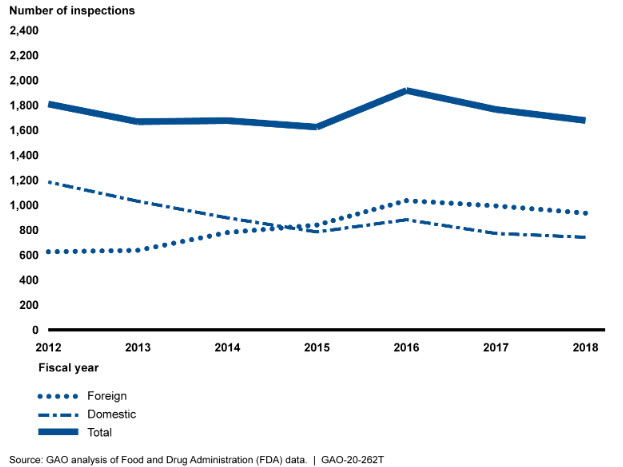 As per analysis of United States Government Accountability Office (GAO), preliminary analysis of Food and Drug Administration (FDA) data shows that from fiscal year 2012 through 2016, the number of foreign drug manufacturing establishment inspections increased. From fiscal year 2016 through 2018, both foreign and domestic inspections decreased by about 10 percent and 13 percent, respectively.