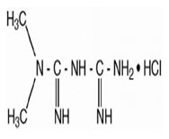 Metformin hydrochloride is an oral antihyperglycemic drug used in the management of type 2 diabetes. Metformin hydrochloride (Biguanide hypoglycemic agent)(N, N-dimethylimidodicarbonimidic diamide hydrochloride) is not chemically or pharmacologically related to any other classes of oral antihyperglycemic agents. Metformin hydrochloride is a white to off-white crystalline compound with a molecular formula of C4H11N5-HCL and a molecular weight of 165.63 g/mol. Metformin hydrochloride is freely soluble in water and is practically insoluble in acetone, ether and chloroform. The pK, of metformin is 12.4.The pH of a 1% aqueous solution of metformin hydrochloride is 6.68. The structural formula is as shown