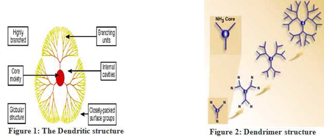Dendrimers are a class of regularly branched mono-dispersed polymer having 5-10 nanometers in diameter.The term dendrimer is derived fromtwo words, the Greek word ‘dendron’, meaning tree, and ‘meros’, meaning part. Dendrimers posses three distinguishing architectural components: