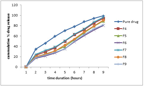 At pH 4.5, the pure drug showed 68.05% while formulation F4, F7 showed 44.20%, 46.52% and formulation F5, F8 showed 42.50%, 44.29% and F6, F9 showed 39.01%, 40.59% respectively.