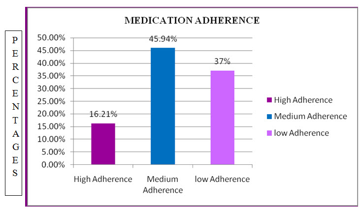 In present study medication adherence have been done .In which patients with High Adherence are with percentage of 16.21%, Medium Adherence are with percentage of 45.94%, Low Adherence are with percentage of 37%. Burnier M et al. conducted a large survey of quantitative studies on Drug adherence in chronic kidney diseases and dialysis. And the review concluded that because of the complexity of treatment and the high pill burden, CKD patients are at very high risk of poor adherence and should definitively be supported in their efforts to maintain a good persistence.