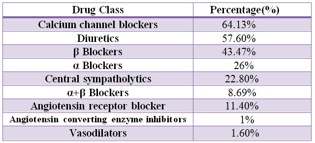 In the present study the most commonly prescribed anti-hypertensives were found to be CCBs 64.13%, Diuretics 57.60%, Beta blockers 43.47%, α blockers 26%,α+β blockers 8.69%, Angiotensin receptor blockers 11.40%, Angiotensin converting enzymes inhibitors 1%, Central Sympatholytics 22.80%, vasodilators 1.60%. Bhanu Priya B et al., conducted a study on Pattern of antihypertensive drug utilization among chronic kidney disease, among the patients, most commonly prescribed was CCBs (39.5%), followed by diuretics (25.12%) (Arshad H. Mohd et al., 2012).
