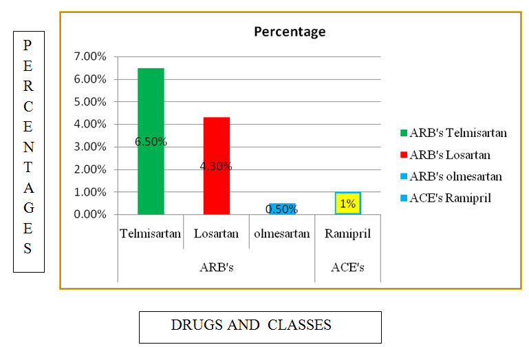 Among the study population most commonly used ARB’s are Telmisartan with percentage of 6.50%, and ACE’s are Ramipril with percentage of 1%.