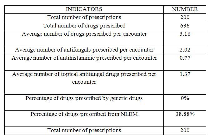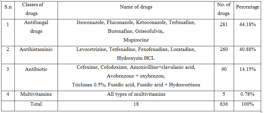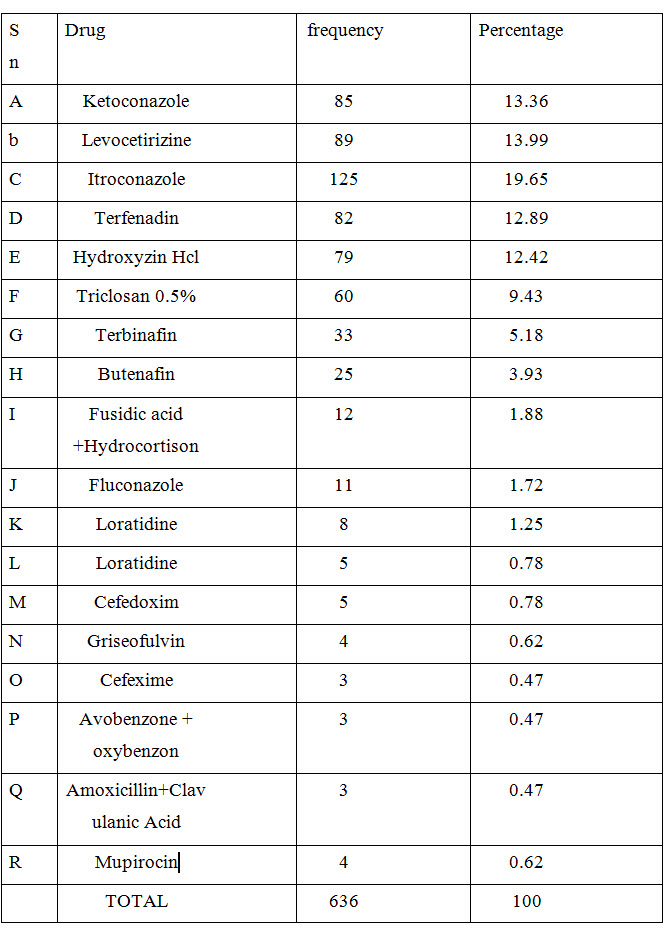 It affects individuals of all ages, neonates to elderly. Owing to its chronic nature, it causes serious impact on quality of life and financial status of the sufferer and his family. The problem gets compounded with the inappropriate and irrational use of medicines. Periodic prescription audit in form of drug utilization study is a way to improve the superiority of prescription and reduce the hazard of irrational prescribing which has become a global phenomenon. Fungal infections are extremely common in the tropical region like Nepal, India and some of them are serious and even fatal. These infections usually occur as a result of decrease in natural defenses (immune compromised, critically ill, advanced age, use of immunosuppressive drugs) or opportunistic heavy exposure to the fungus. Fungal infection is due to the countries hot and humid climatic conditions, economic (poor hygiene) and social (overcrowding) are known to adversely influence the course of the infections. These fungi have the capability to produce keratinase, which allow them to metabolize and live on human keratin like skin, hair and nail. They produce diverse human infections ranging from superficial skin infection to internal organ invasion (systemic diseases).Superficial fungal infections are not life threatening, but associated with a significant decrease in quality of life. They can be very uncomfortable and may spread to other individuals or become invasive. Most of the superficial and subcutaneous fungal infections are treated by antifungal drugs but the cases of resistance are on the rise.