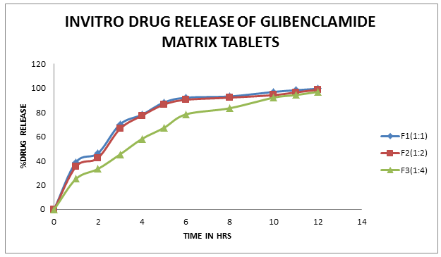 Controlled release matrix formulations of Glibenclamide were prepared with Ethyl cellulose polymer by using different drug-polymer ration of 1:1(F1), 1:2(F2) and 1:4(F3). Conventional tablets(F4) of Glibenclamide were also formulated with out polymer. Here Lactose and Talc were used as diluent and Magnesium stearate was used as lubricant. Matrix tablets were prepared by wet granulation method. Required quantity of Drug, Ethyl cellulose and Lactose weighed, mixed well and passed through sieve no-60, powder mixture was wetted with sufficient quantity of Starch mucilage. The wet mass was passed through sieve no-16 and obtained granules were dried at 600c for 30 min. the dried belts granules were passed through sieve no-22. It was weighed and lubricated using Magnesium stearate and Purified Talc. Conventional tablets were also prepared as same as matrix tablets with out using ethyl cellulose. The granules were compressed by using a single stroke tableting punch machine manually(cad Mach). Prior to compression the weight and hardness adjustments were done. The compressed tablets were evaluated for their weight variation, hardness, friability, drug content and in-vitro drug release.