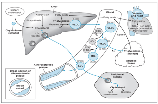 Lipids are carried in plasma in lipoproteins after getting associated with several apoproteins plasma lipid concentrations are depended on the concentration of lipoproteins. The core of lipoprotein globules consists of TG and cholesteryl esters. The outer polar layer has phospholipids, free cholesterol and apoproteins. Dietary lipids are absorbed in the intestine with the help of bile acids. Chylomicrons are formed and passed in to lacteals reach blood stream via thoracic duct. Liver secrets very low density lipoproteins containing mainly TG and CHE in to blood. VLDL is acted upon by endothelial lipoprotein lipase in the same way chylomicrons and the fatty acids pass in to adipose tissue and muscle. The remnant called IDL now contains more CHE than TG about half of the IDL is taken back by the liver cells by attachment to another receptor (LDL) while the rest lose the TG and becomes LDL containing only CHE.