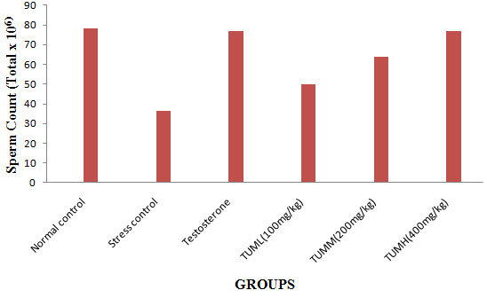Figure 10: Effect of Testosterone and methanolic extract of Tamilnadia ulignosa on sperm count (Total × 106)