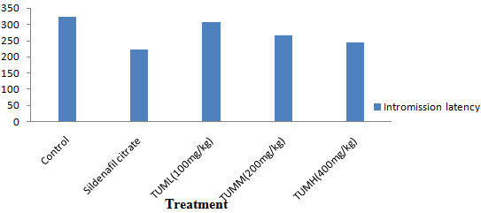Figure No:8 Histogram(Intromission latency) showing the aphrodiasic activity of methanolic extracts of T. ulignosa