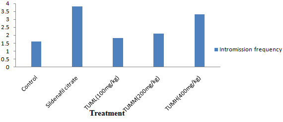 Figure No:7 Histogram(Intromission frequency) showing the aphrodisiac activity of methanolic extracts of T. ulignosa