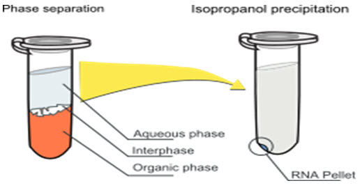 In a final step, RNA is improved from the aqueous phase by precipitation with 2-propanol or ethanol. DNA will be placed in the aqueous phase in the absence of guanidinium thiocyanate and hence, the technique can be used for DNA purification alone.