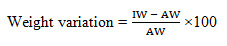 Weight variation for tablets should not exceed 10% or more having average weight of 80 mg or less (British Pharmacopoeia, 2005). Weight variation test is the test by which variation of weight from tablet to tablet may be determined. Weight variation was conducted to ensure that, each of tablets contains the right amount of drug. The test was performed by weighing the 10 tablets individually using analytical balance, then calculating the average weight, and comparing the individual tablet weights to the average. The deviation of the weight of the tablets from the average weight was calculated as the weight variation (Sarwar et al. 2013). The following formula is used: