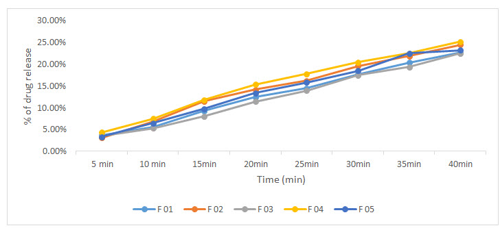 The results of dissolution were noted in figure 1. The dissolution test is used to determine the amount of the drug released into the dissolution medium with time. All formulation release more than 20% drug in 1st 40 minute. These results support the analytical criteria mentioned in BP and USP which encourages the formulation of atorvastatin calcium sustain release tablet in large volume to address respective illness patterns.