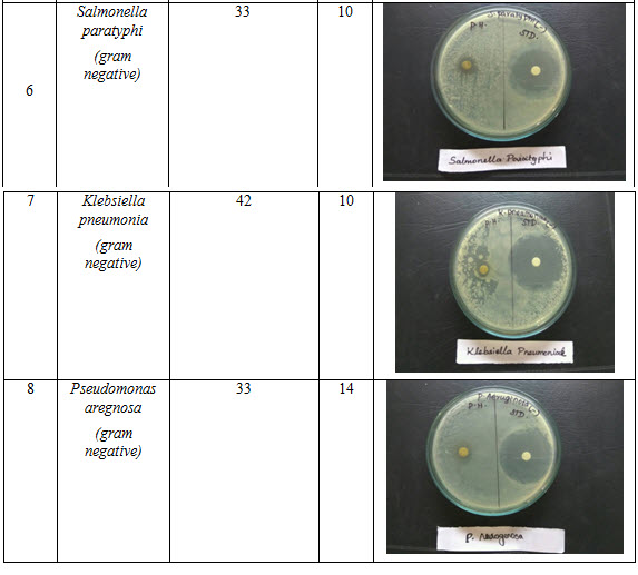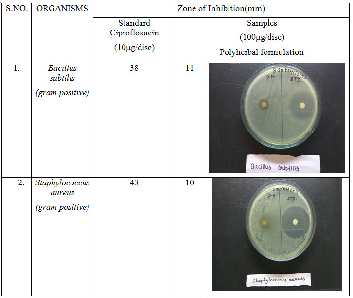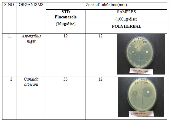 Antibacterial activity of poly herbal extract, Ciprofloxacin (Standard) and Fluconazole (standard for antifungal activity) are presented in table 2. The poly herbal extract has showing good response against E. coli (antibacterial) and Aspergillus niger (antifungal) with zone of inhibition of 34 mm.and12mm. Respectively when compared to the standard drugs (33 mm and 12 mm respectively). Rest of other microbesthe zone will be moderately inhibited by poly herbal extract when compared to the standard drugs.