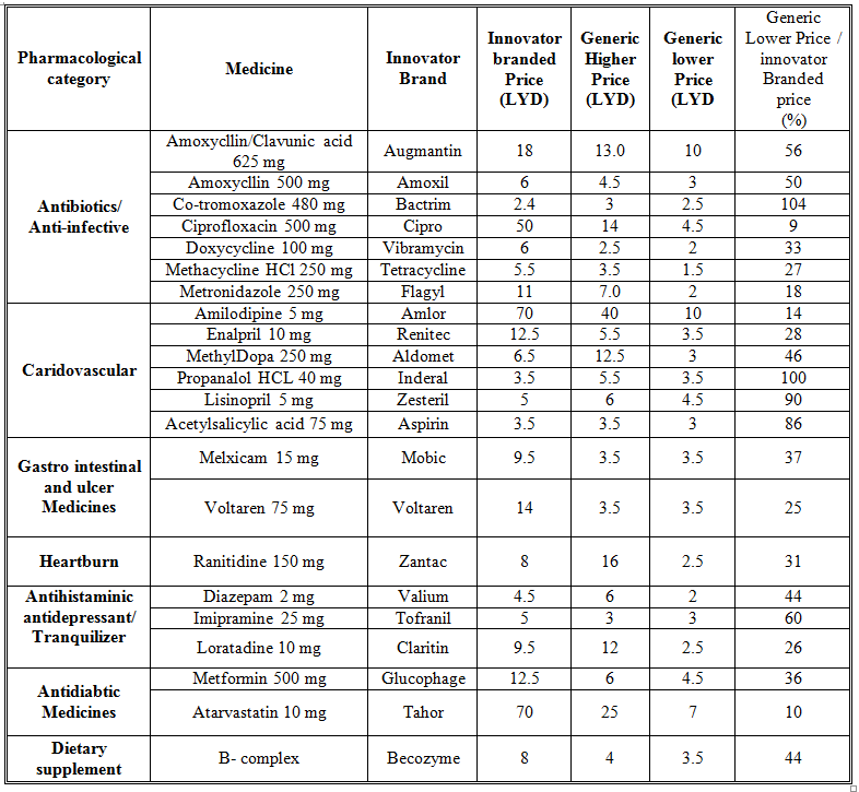 This study involved a survey of generic and branded medicines available on the local privet market, Tripoli, Libya. The study was performed during the shift hours of 69 pharmacies located in different area of Tripoli. In order to avoid any adherence in data, no previous notes about the aim of the study was give to the pharmacies. Generic name, batch number, manufacture date, expiry date, strength and manufacturer name as appeared on the package for each medicament were recorded in predesigned forum. The local sale price for each drug at the time of study was also recorded and compared.