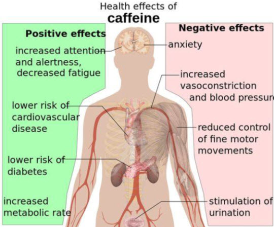 It shows caffeine side effects including jitteriness, headache, fast heartbeat, and others.