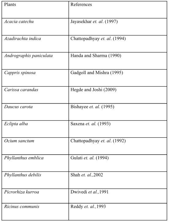 List of few plants with hepatoprotective property against toxic chemical induced liver damage in experimental animals.