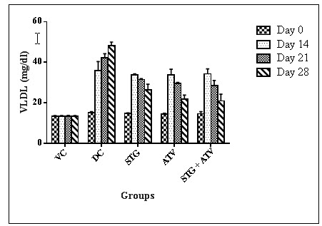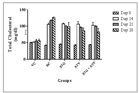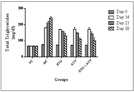 Elevation in plasma TG and cholesterol level usually indicates raised levels of serum LDL-C. Increased LDL-C levels may result in formation of oxidised LDL-C (ox-LDL), a precursor for atherosclerotic process.There exists an inverse relationship between HDL-Cholesterol and risk of coronary heart diseases. Low concentrations i.e. below 30mg/dL in humans are one of the risk factors for cardiac ailments (Harrison D et al., 2003). It was observed that the serum glucose level, serum cholesterol level, serum triglyceride level, low density lipoprotein levels, atherosclerotic index, cardiac risk ratio and atherosclerotic coefficient were observed to be significantly lowered in combination than that of individual treatment on 21st and 28th day of the experimental model. High density lipoprotein levels were found to be more significantly increased in combination group than that of individual group on 21st and 28th day of experimental model. This suggests that the combination showed pharmacodynamic drug interaction. The serum parameters were not found crossing the lower limit of normal range hence not a harmful interaction.