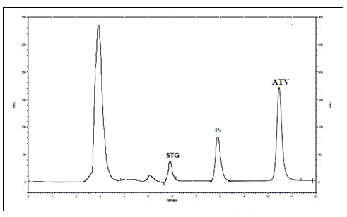 Drugs were extracted from plasma samples using protein precipitation technique. Ammonium acetate buffer (100μl of 100mM) was added to each plasma sample for protein precipitation. The samples were then vortex-mixed for 2min. Further 1ml methanol was added for extraction of Sitagliptin phosphate or Atorvastatin calcium respectively, then vortex-mixed for 2min and centrifuged at 5500 rpm, 5oC for 10 min. The clear supernatant layer was separated in a glass test tube and evaporated to complete dryness under the nitrogen evaporator at 60°C. After drying, the residue was reconstituted in 250μl of mobile phase. Samples were vortex-mixed for 1min then put in insert tubes inside the pre-labelled HPLC vials and 50μl were injected into the RP-HPLC column for analysis.