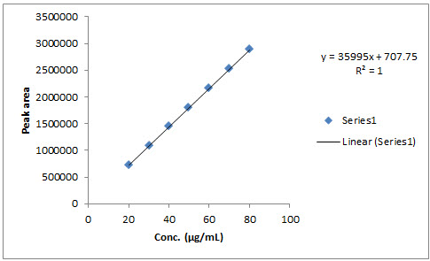 6. Linearity:It is the ability of the method to elicit test result that is directly proportional to analytic concentration within a given range. It is generally reported as variance of slope or regression line. It is determined by series of three to six injections of five of more standards. Different levels of solution were prepared and injected to the chromatographic system and the peak area was measured.Plotted a graph of peak area versus concentration (on X-axis concentration and on Y-axis Peak area) and calculate the correlation coefficient. The calibration curve was represented in fig. no. 3 and 4. The data are represented in table no. 5 and 6.